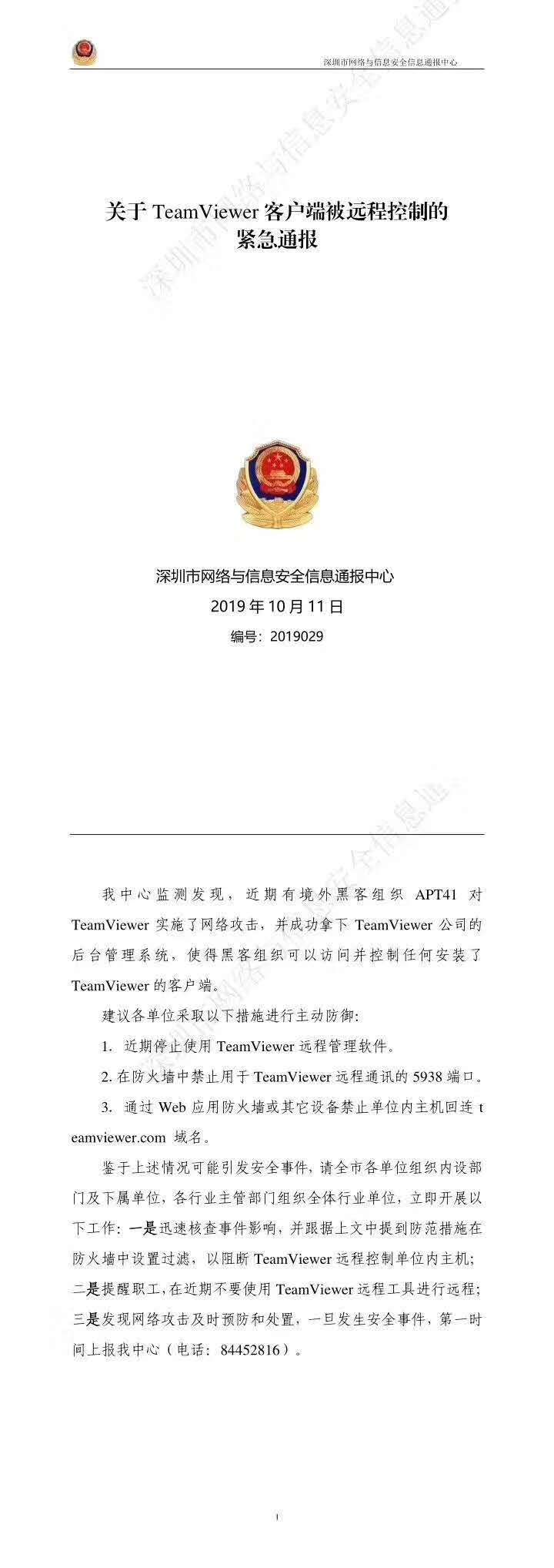 鑒于上述情況可能引發(fā)安全事件,請(qǐng)各單位組織內(nèi)設(shè)部門及下屬單位,各行業(yè)主管部門組織全體行業(yè)單位,立即開(kāi)展以下工作:一是迅速核查事件影響,并根據(jù)上文中提到防范措施在防火墻中設(shè)置過(guò)濾,以阻斷TeamViewer 遠(yuǎn)程控制單位內(nèi)主機(jī);二是提醒職工,在近期不要使用TeamViewer 遠(yuǎn)程工具進(jìn)行遠(yuǎn)程;三是發(fā)現(xiàn)網(wǎng)絡(luò)攻擊及時(shí)預(yù)防和處置,一旦發(fā)生安全事件,第一時(shí)間上報(bào)我公司(電話:82199263)